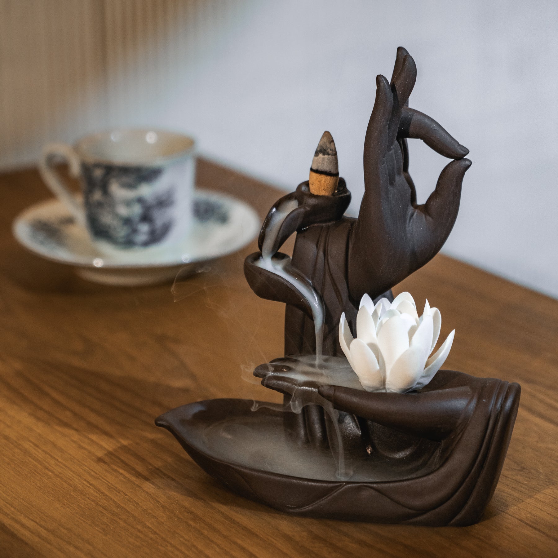 In love with this burner. I had an issue in the beginning with it not flowing. To avoid this just make sure you align the holes on the incense cones with the ceramic holes. The smoke will naturally flow downard and look like water. It smells grea too and helps you relax. You can place it anywhere, I am thinking about buying another...